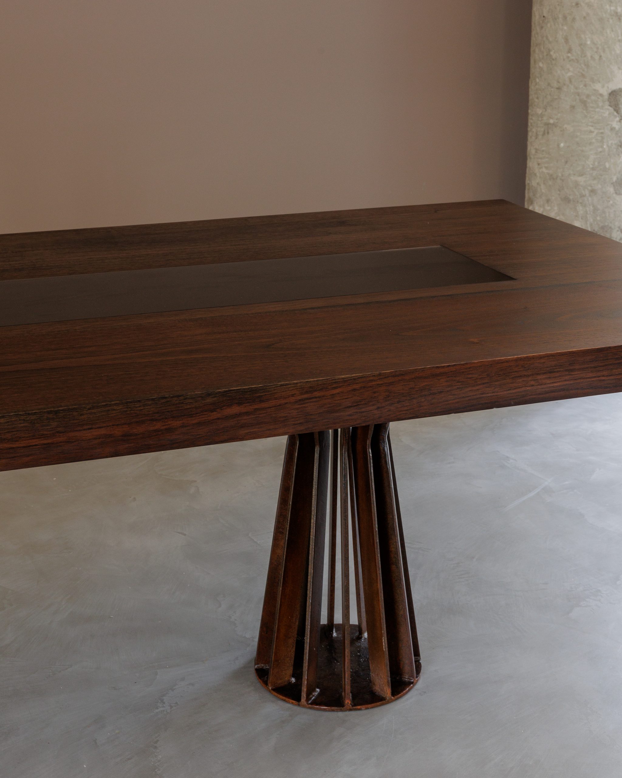 Comedor Orinoco, elaborada en cedro macizo conservando su propia naturaleza, detalle de vidrio templado color natural en la mitad, base en hierro, tipo C
